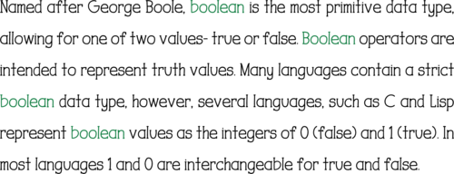 > Named after George Boole, boolean is the most primitive data type, allowing for one of two values - true or false. Boolean operators are intended to represent truth values. Many languages contain a strict boolean data type, however, several languages, such as C and Lisp represent boolean values as the integers of 0 (false) and 1 (true). In most languages 1 and 0 are interchangeable for true and false.